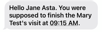 - Message: {WorkerName} has not clocked in for their visit with {PatientName} that was expected to start at {ExpectedArrivalTime}.