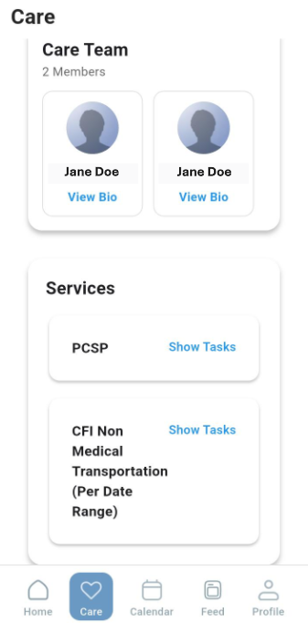 The Care screen serves as a central hub for understanding both the individuals providing care and the specific services being delivered to your loved one.