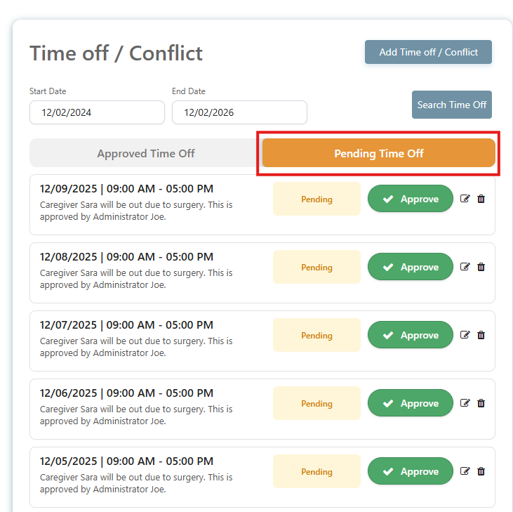 You can view all Pending Time Off requests below. Administrators can approve a request by clicking the green button, which will move it to the Approved Time Off section.