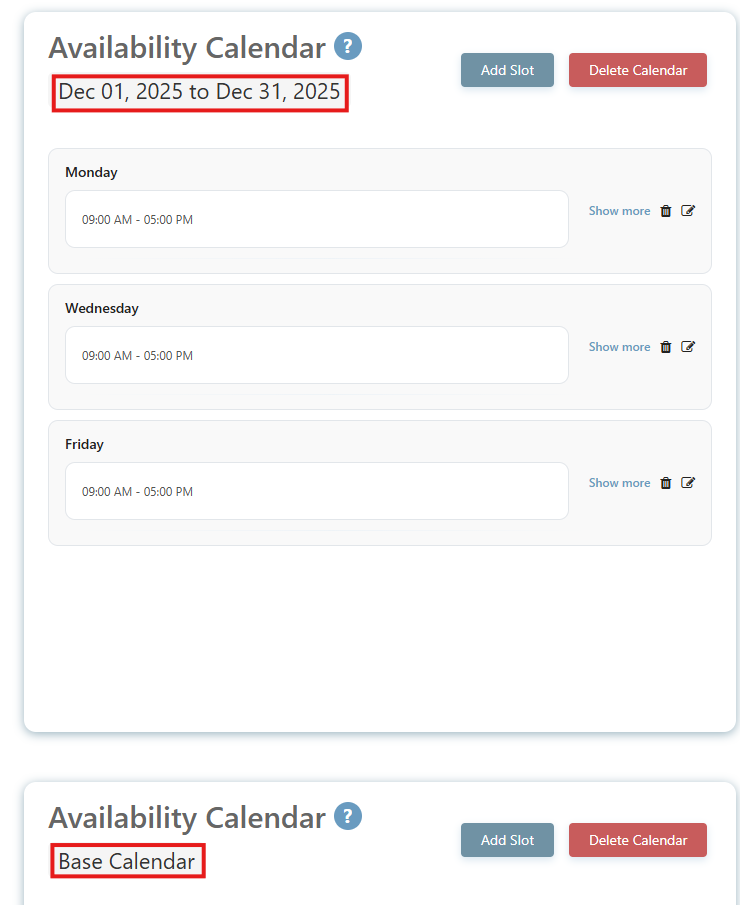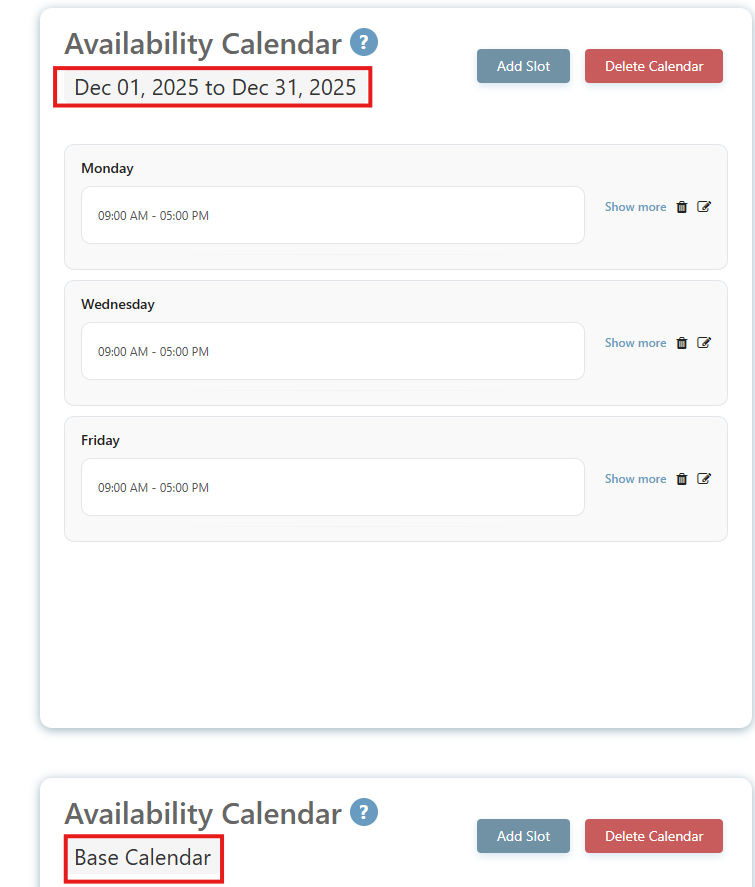 The dated Availability Calendar will override any overlapping entries set in the Base Calendar. You can view both calendars by scrolling down within the Availability tab.