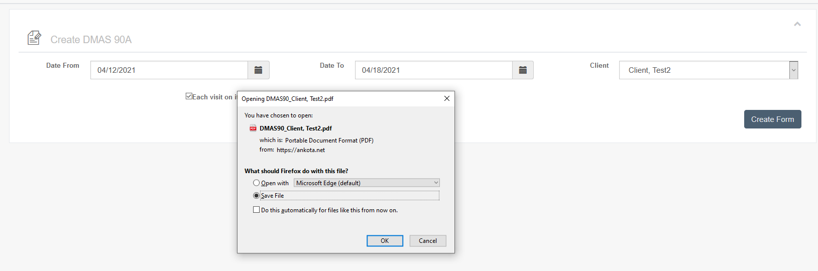 When creating the DMAS90A, you will select the desired date range, client name, and either check or leave unchecked the option to separate out each visit on its own page (per your company's preference) before clicking the Create Form button. Then you can open or save the file to your desktop and review it as needed.