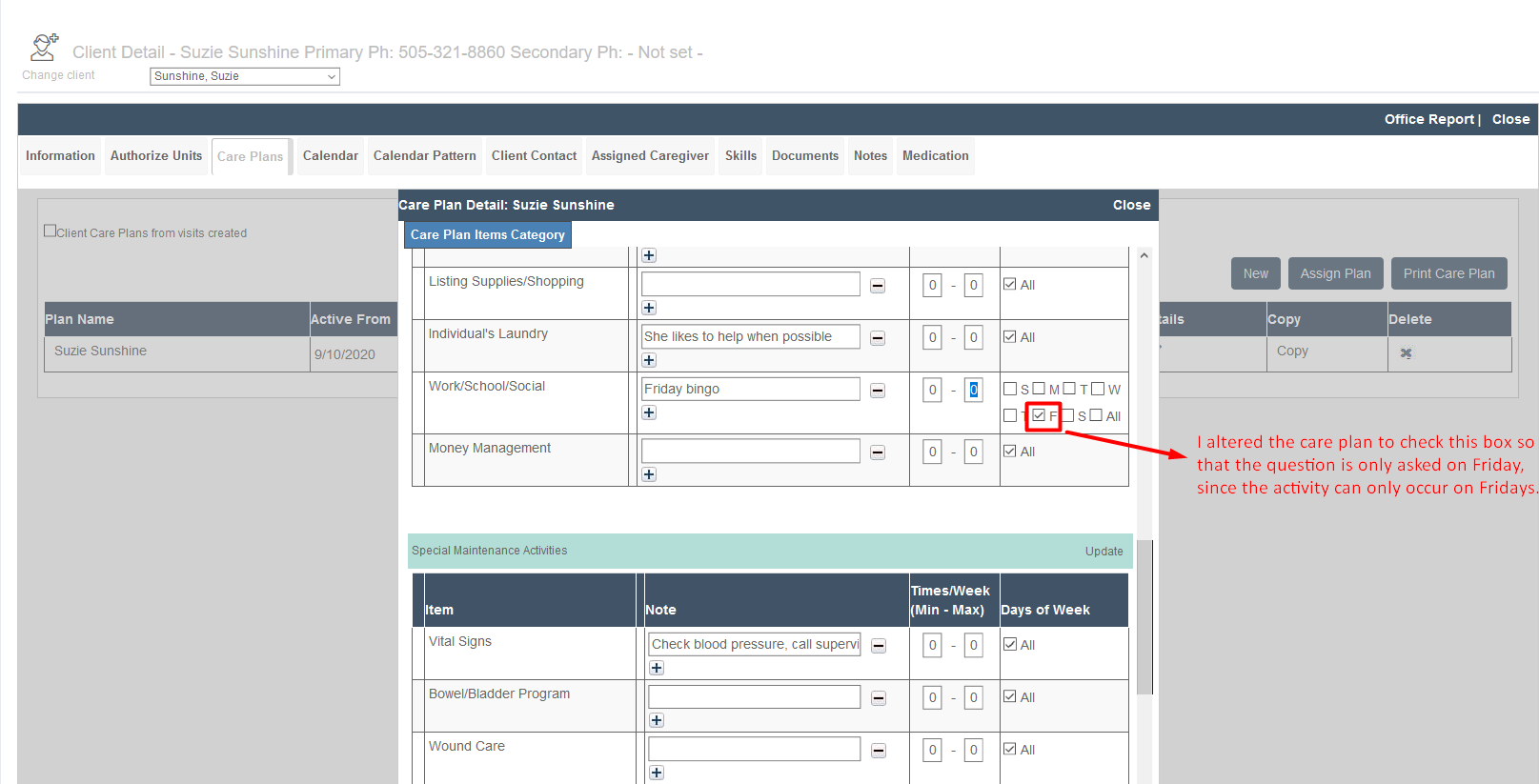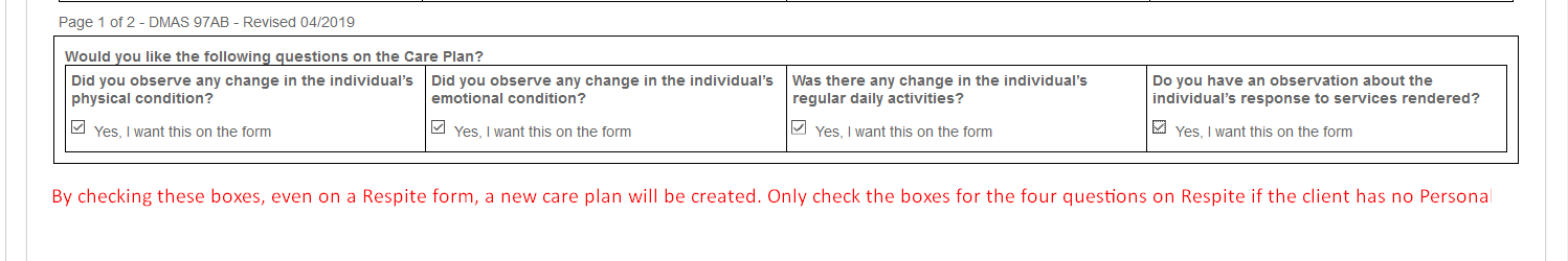 Please note that for clients who only have Respite, with no Personal Care, you will want to turn on the four questions and therefore create a care plan, even if everything else is still PRN.