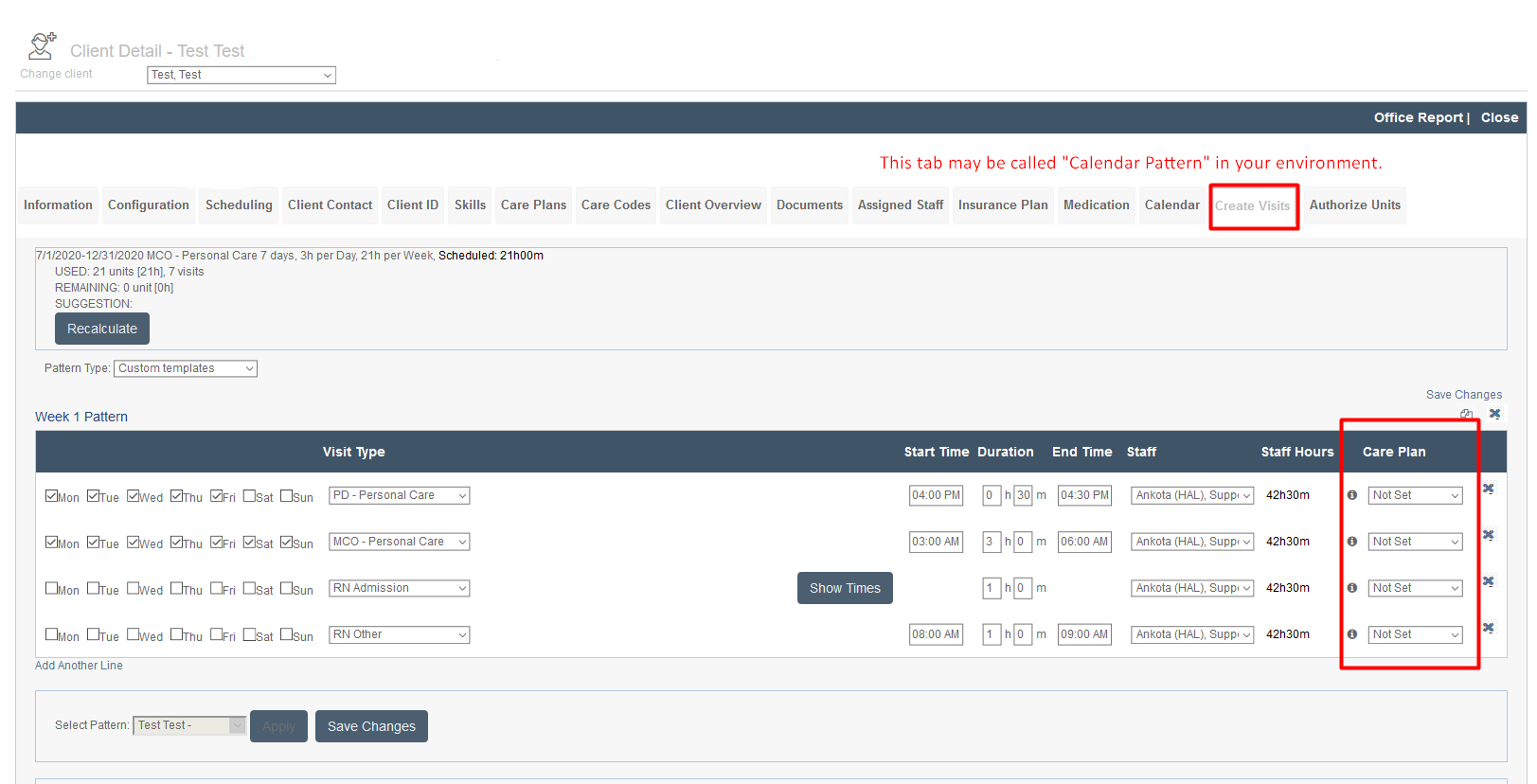Please note that if you need a second care plan due to differing services in the morning and evening, you will need to either schedule using the historic Create Visits function, or you will need to adjust the Calendar Pattern after scheduling the visits in calendar-based scheduling.