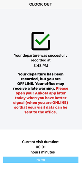 Once the caregiver is in an area with appropriate signal/bandwidth, all recorded information will be sent to Ankota.net. The main idea is to still capture the clock in/out time and care plan items (to reduce administrative work). If your caregiver continues to do offline visits often for a specific client, it may be in your best interest to try a different clock-in method such as IVR. NOTE: If all visits are being flagged as offline, you may be in a low-signal area. Contact Ankota Support to request that the threshold for "offline" be raised to several minutes so that the mobile app can continue attempting to connect for an extra minute or two in your area before going into offline mode.